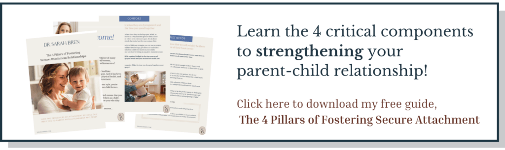 Okay, so you are listening to a podcast called Securely Attached. So you probably know that a child forming a secure attachment bond to their parent or primary caregiver could be an important predictor of mental health and wellbeing throughout your child’s entire lifetime. But do you sometimes find yourself wondering exactly how do I help them establish that secure attachment bond to me? In my free guide, Four Pillars of Fostering Secure Attachment, I will teach you four simple things that you can focus on in your parenting that will do just that. You’ll learn straightforward strategies to help you attune to your child’s brain and body, and how to use your parent-child relationship as the key to helping your child feel safe, seen, and secure. To get this free guide, just go to drsarahbren.com/secure. That’s drsarahbren.com/secure.